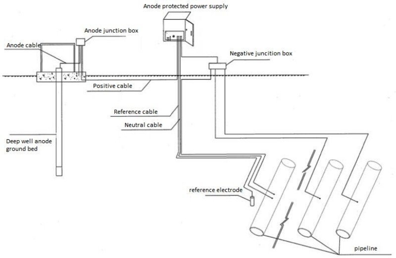 Cathodic protection by external current is a method of protecting metal structures by applying an external direct current power supply and auxiliary anodes. This method involves supplying the metal with a large number of electrons, so that the protected metal is in a state of excess electrons throughout, and the surface points of the metal reach the same negative potential. This method is used to protect large metal structures or those located in high soil resistivity soil, such as long-distance buried pipelines and large tank groups.